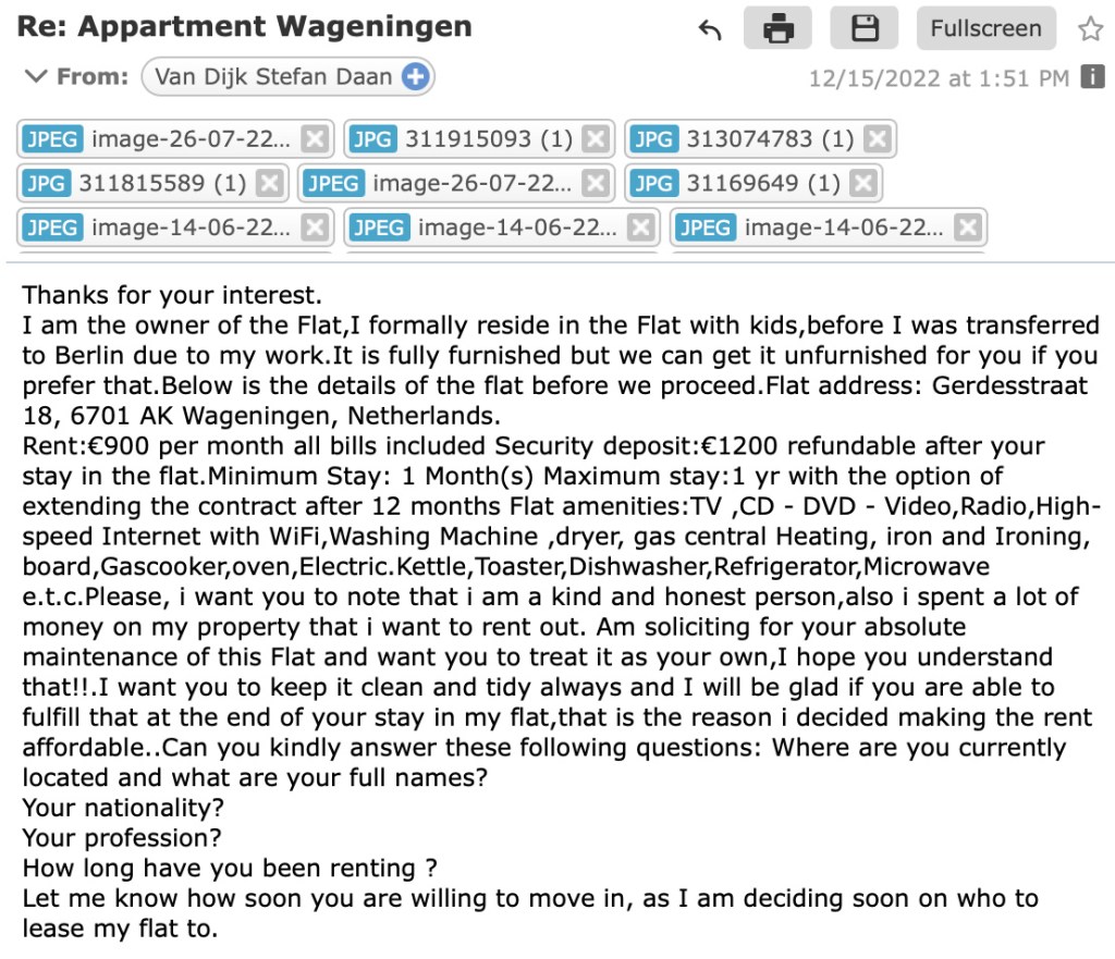 - Scammers gebruiken meestal vergelijkbare teksten voor advertenties. Alle kenmerken van de woning worden uitgebreid opgesomd, er is geen duidelijke huurtermijn (dat mag je zelf bepalen, wat in de extreem drukke woningmarkt in Nederland ongewoon is), het is volledig gemeubileerd, de prijs is inclusief gas, water, elektra en internet (dat wordt in Nederland bij gewone huur altijd apart berekend), en de lokatie is altijd perfect (dichtbij de universiteit, winkels en stadscentrum). Het gaat hierbij niet om de losse elementen, maar om de combinatie ervan.