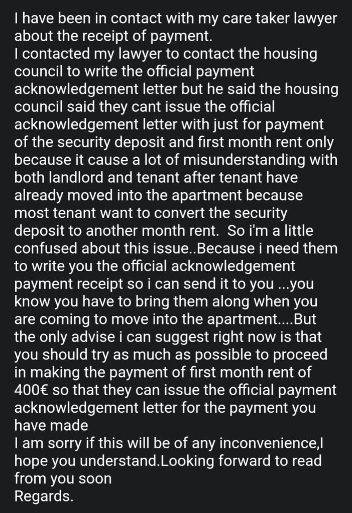 - Als er wordt gezegd dat een advocaat betrokken is bij de betaling, er een ‘huisvestingscommissie’ naar het contract heeft gekeken, of als er tussentijds sprake is van anderssoortige ‘complicaties’ waardoor je de betaling toch anders moet doen, wees dan op je hoede. Dat is typisch scammersgedrag.