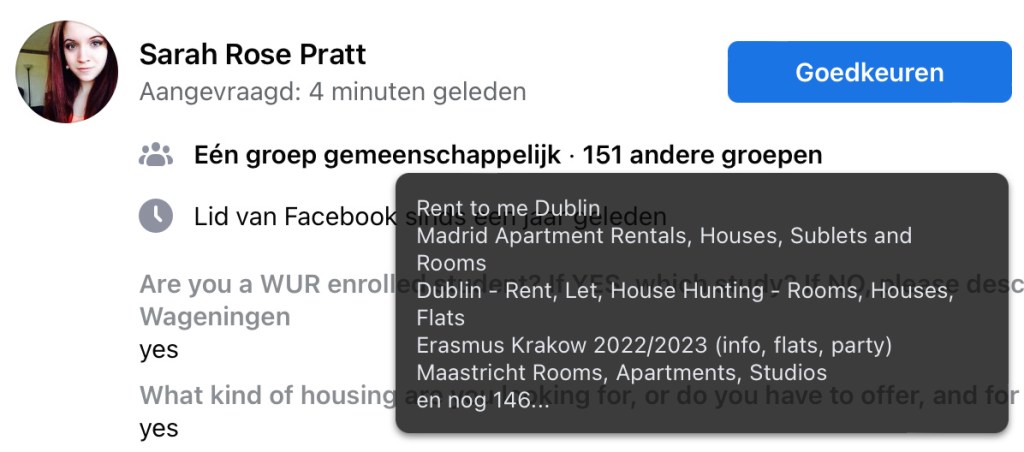 - Check van hoeveel groepen iemand lid is. Meer dan 100 is een rode vlag. Check ook wat voor groepen dat zijn. Scammers zitten vaak in meerdere huisvestingsgroepen in meerdere landen en steden.